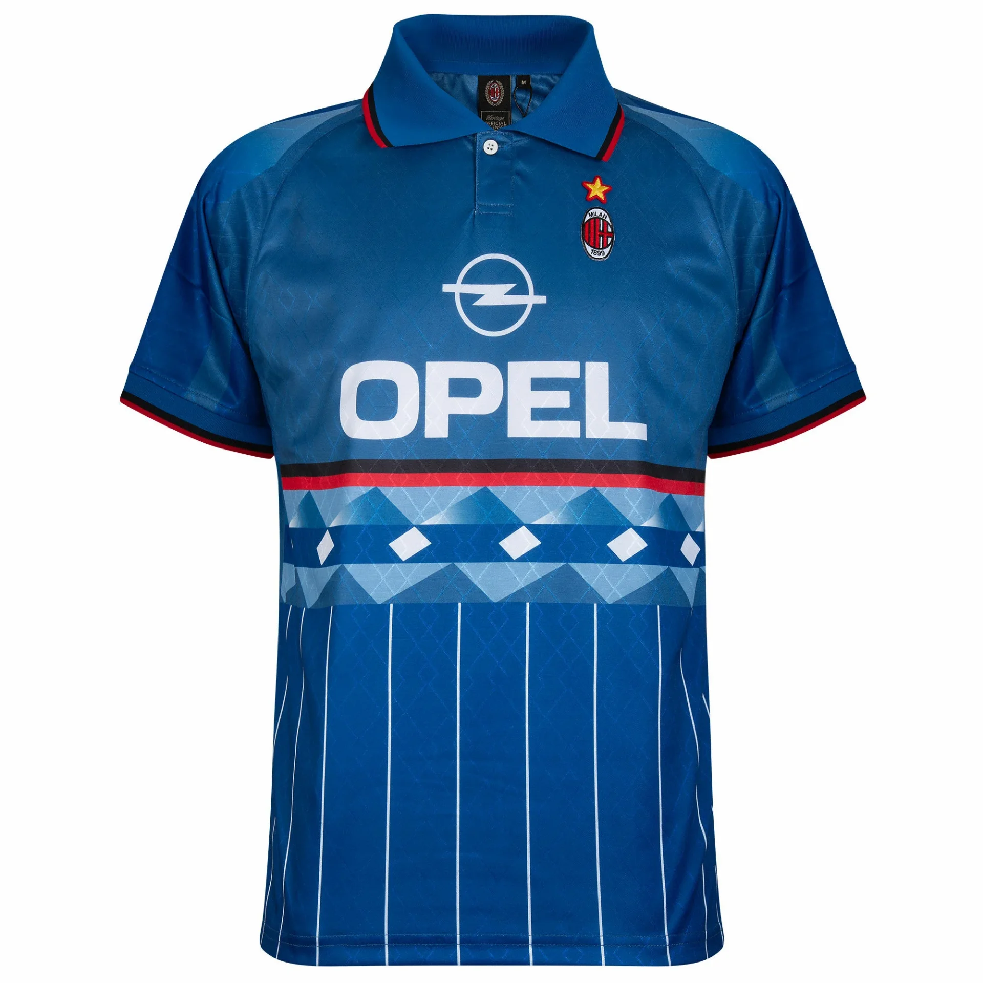 This is the official AC Milan 4th retro football shirt 1995-1996. This Milan retro football shirt is based on the fourth football shirt of AC Milan from the 1995/96 season. The retro football shirt is predominantly blue. The name of the then sponsor OPEL is on the middle. The left chest contains the logo of AC Milan with a golden star above it. The bottom of the retro football shirt has thin white stripes. Furthermore, this AC Milan retro football shirt has a neck with a button and a blue polo collar with a red and black line on it. The piping also contains these colors. Great AC Milan football shirt for the real Milan fan! The AC Milan retro football shirt by Score Draw has a normal fit. Material: 100% recycled polyester.