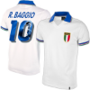 This is the Italy retro football shirt 1982 World Cup from COPA Football. The back contains a special photo style print by R. Baggio (10). The figure contains an image of the player. The retro shirt is based on the away shirt that the Italians wore during the World Cup 82. The Italy retro football shirt is mainly white and contains a classic v-neck with a polo collar in blue. In addition, this collar is equipped with the colors of the Italian flag (red, white and green). These colors are also reflected in the trim at the bottom of the sleeves. The left chest is equipped with the vintage logo of the Italian Football Federation. The COPA retro shirts have a normal fit and are delivered in a luxurious gift box. Material: 50% Polyester - 50% Cotton.