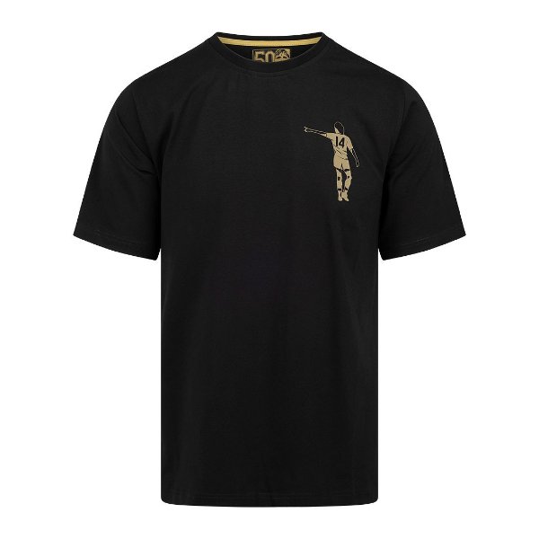 Cruyff Dos Rayas Print t-shirt from the Netherlands for adults. This 'Two Stripes' t-shirt from Cruyff is in black and has a round neck. The left chest contains a gold graphic print of a pointing Johan Cruijff. A special graphic on the neck in honor of the 50th anniversary since the 1974 World Cup. Wonderfully stylish t-shirt from Cruyff for the real fan! Material: 95% cotton - 5% elastane.