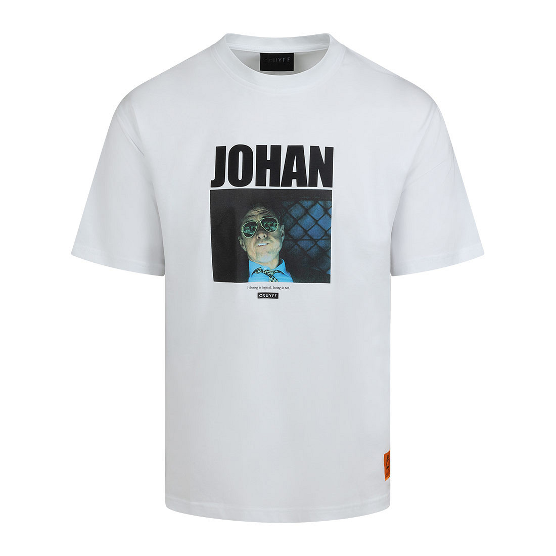 Johan Cruijff t-shirt in white for men. The Cruyff t-shirt is completely white and has a round neck. The Johan t-shirt by Cruyff is characterized by a photo print of Johan Cruijff with sunglasses and a lollipop in his mouth in the middle of the chest. Johan Cruijff had two addictions in his life: smoking and football. After heart surgery, Johan stopped smoking and instead he took lollipops. Also regularly in the dugout of Barcelona, and because of this lollipops also became very popular in Catalonia. The cool Cruyff t-shirt with photo print of Johan has a normal fit. Material: 90% cotton and 10% elastane.