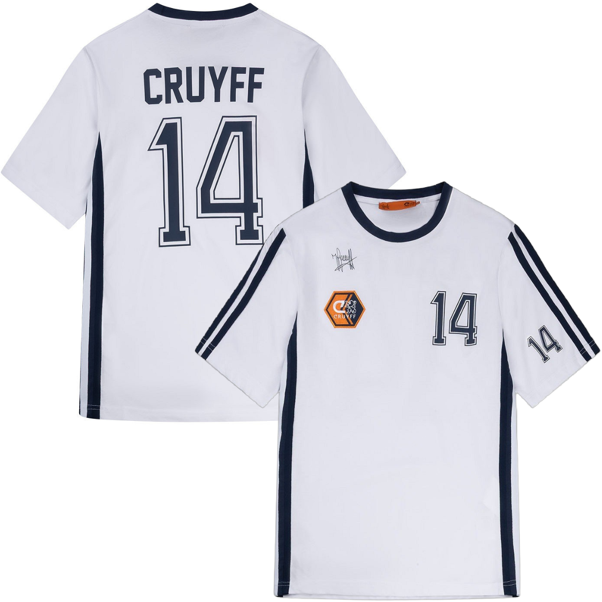 The design combines a fresh white base with bold navy blue accents. The round neck and the signature stripes across both sleeves and along the sides are executed in navy blue, creating a sporty and authentic retro look. On the right chest, the signature of Johan Cruyff is featured, accompanied by a special Cruyff badge. The left chest displays the iconic number 14.