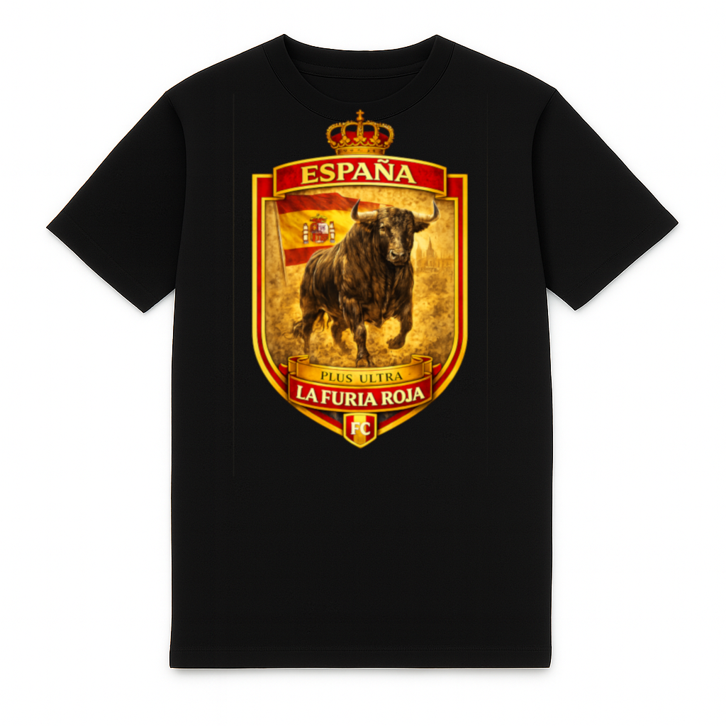 Stylish Spain heavy T-shirt by FC ELEVEN for adults. This heavy T-shirt is made from heavyweight organic cotton. The back of the T-shirt features a print of a shield with a 3D bull and the Spanish flag in the background. The top is decorated with the country name, ESPAÑA, and the bottom features the text: La Furia Roja. This print is fully in line with the national colors: yellow and red. The T-shirt also features the FC initials in black on the left chest, made of silicone. The heavy T-shirt is completely black and has a round neckline. It is made from heavyweight cotton and has a regular fit. Material: 100% organic cotton.