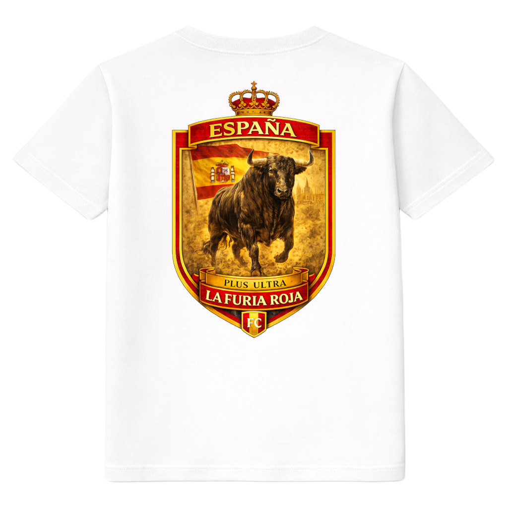 Stylish Spain heavy T-shirt by FC ELEVEN for adults. This heavy T-shirt is made from heavyweight organic cotton. The back of the T-shirt features a print of a shield with a 3D bull and the Spanish flag in the background. The top is decorated with the country name, ESPAÑA, and the bottom features the text: La Furia Roja. This print is fully in line with the national colors: yellow and red. The T-shirt also features the FC initials in black on the left chest, made of silicone. The heavy T-shirt is completely black and has a round neckline. It is made from heavyweight cotton and has a regular fit. Material: 100% organic cotton.