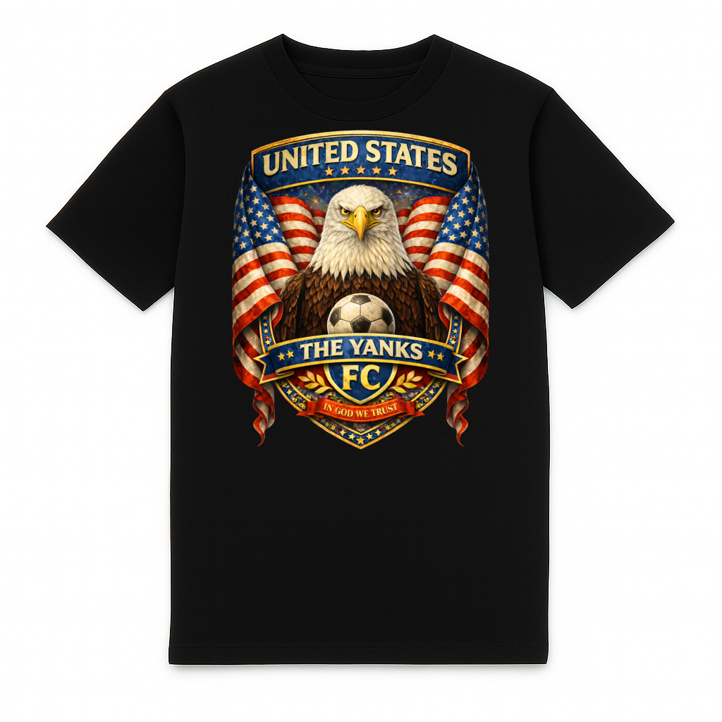 Cool United States soccer T-shirt by FC ELEVEN for adults. The heavy T-shirt is made from thick organic cotton. A distinctive feature of this T-shirt is the colorful graphic print of the United States on the back. The print includes the texts The Yanks and United States, with an American bald eagle in the center. On the left chest are the initials FC in black as a silicone logo. The heavy T-shirt is completely black and features a round neckline. The T-shirt is made from heavy cotton and has a regular fit. Material: 100% organic cotton.