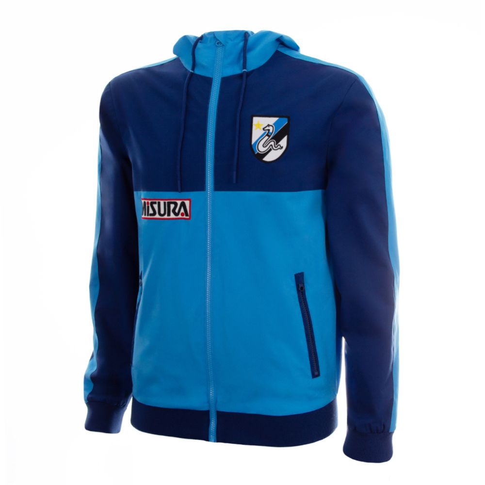The windrunner includes a hood and two zipped pockets. It is part of the official FC Internazionale collection by COPA Football and offers a distinctive retro look.
