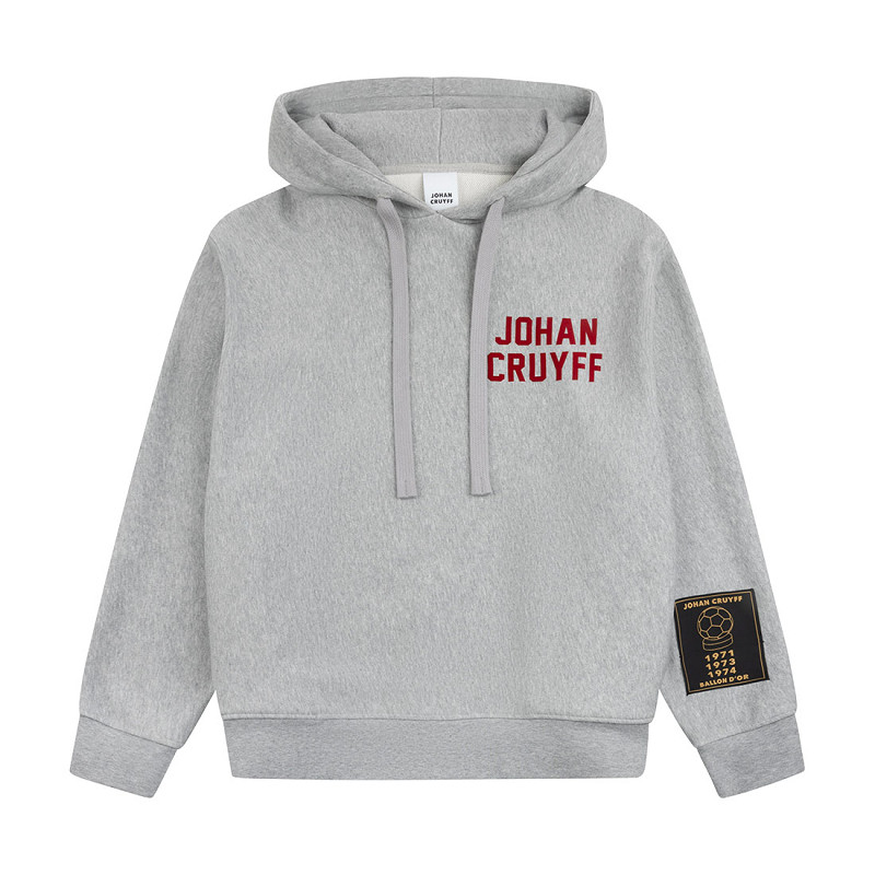 Stylish Johan Cruyff hoodie in grey for adults. This premium hoodie is made from 100% heavy French terry cotton and features a relaxed fit for optimal comfort. A white Johan Cruyff logo is placed on the chest. The Ballon d'Or patch on the left sleeve shows the years in which Johan Cruyff won this prestigious award. Ribbed collar and hem give the hoodie a refined and high-quality look. A perfect combination of comfort, style and football heritage.