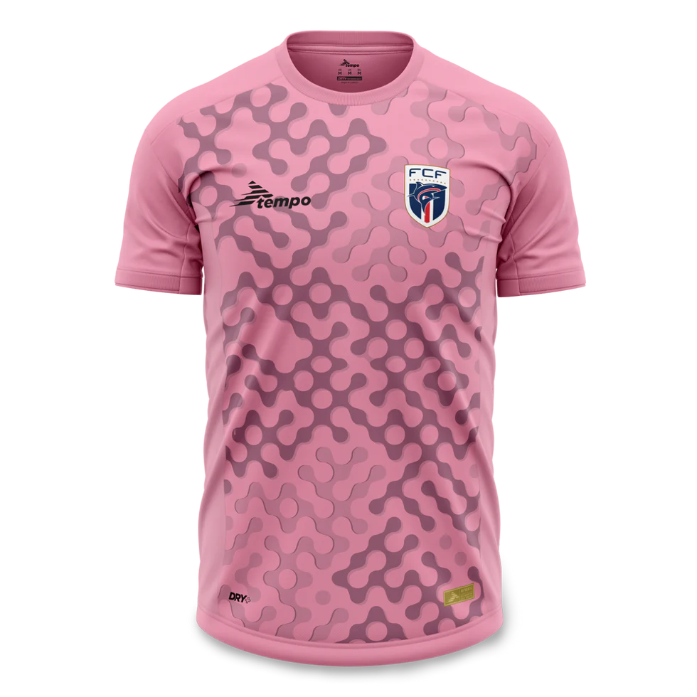This is the official Cape Verde 2024/25 goalkeeper shirt for adults from the brand Tempo Sport. The national team goalkeeper of Cape Verde will wear this shirt during international matches throughout the 2024–2025 period. The Cape Verde GK shirt is predominantly pink and features an all-over print on the front. The back and sleeves are entirely pink. The Tempo sponsor logo is displayed on the right chest, while the badge of the Cape Verde national football association adorns the left chest. A shark graphic is placed on the back of the neck, referring to the nickname of the national football team: Tubarões Azuis (Blue Sharks). The Cape Verde goalkeeper shirt has a regular fit.